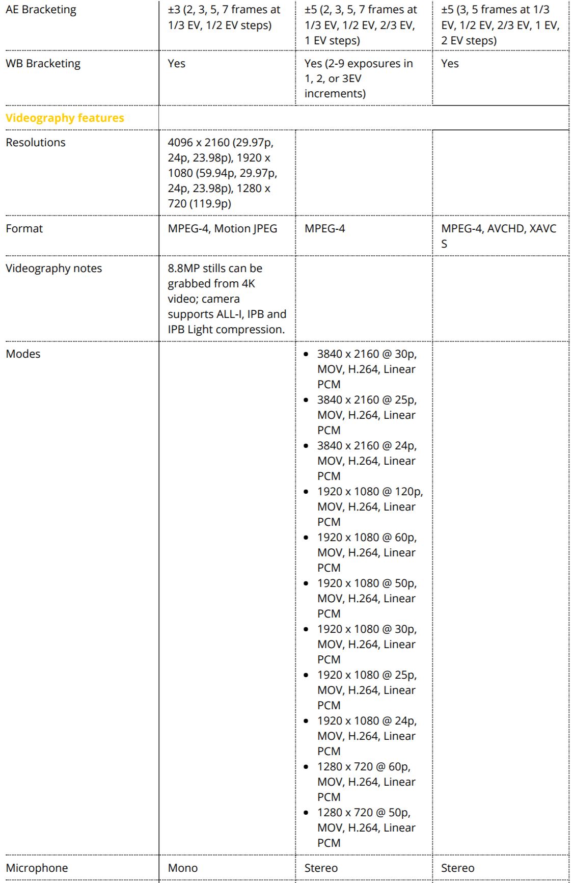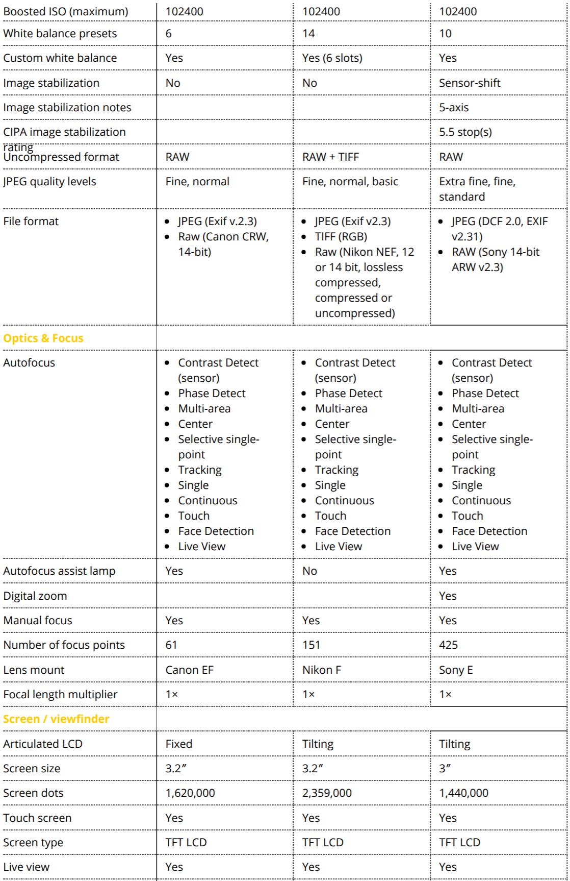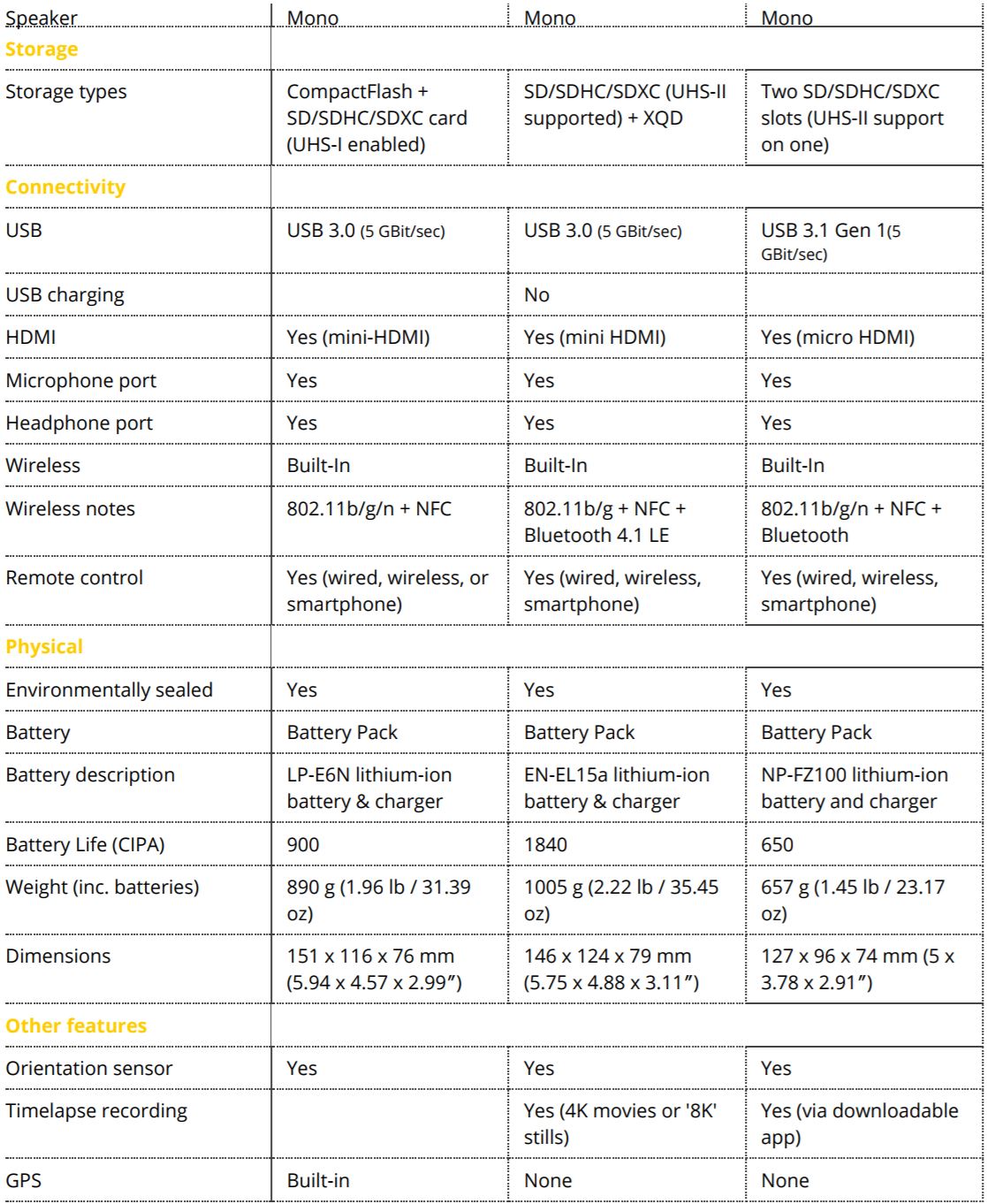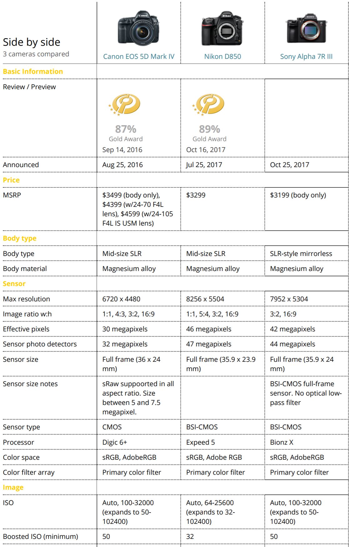 Here is quick specs comparison for the new announced Sony a7R III (Amazon/B&H Photo Video/Adorama) and Nikon D850 (Amazon/B&H/Adorama) and Canon 5D Mark IV (Amazon/B&H/Adorama). The US price for Sony a7RIII body is $3,198.00, will be shipping in late November, 2017. See also: Sony a7R III Vs. Sony a7R II.